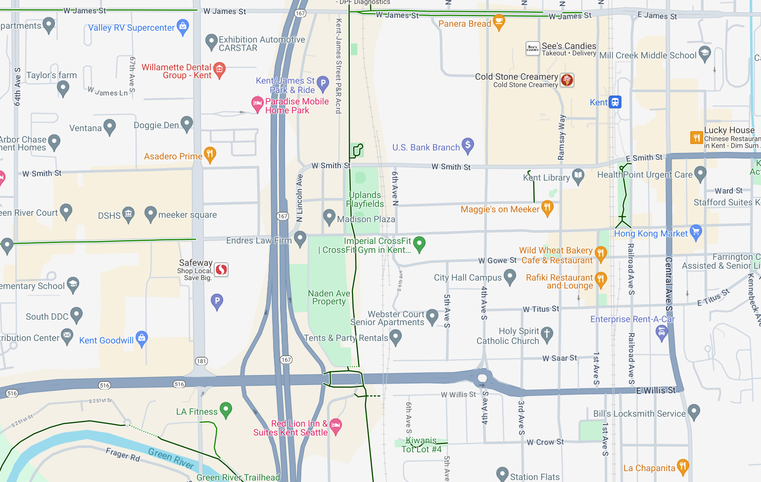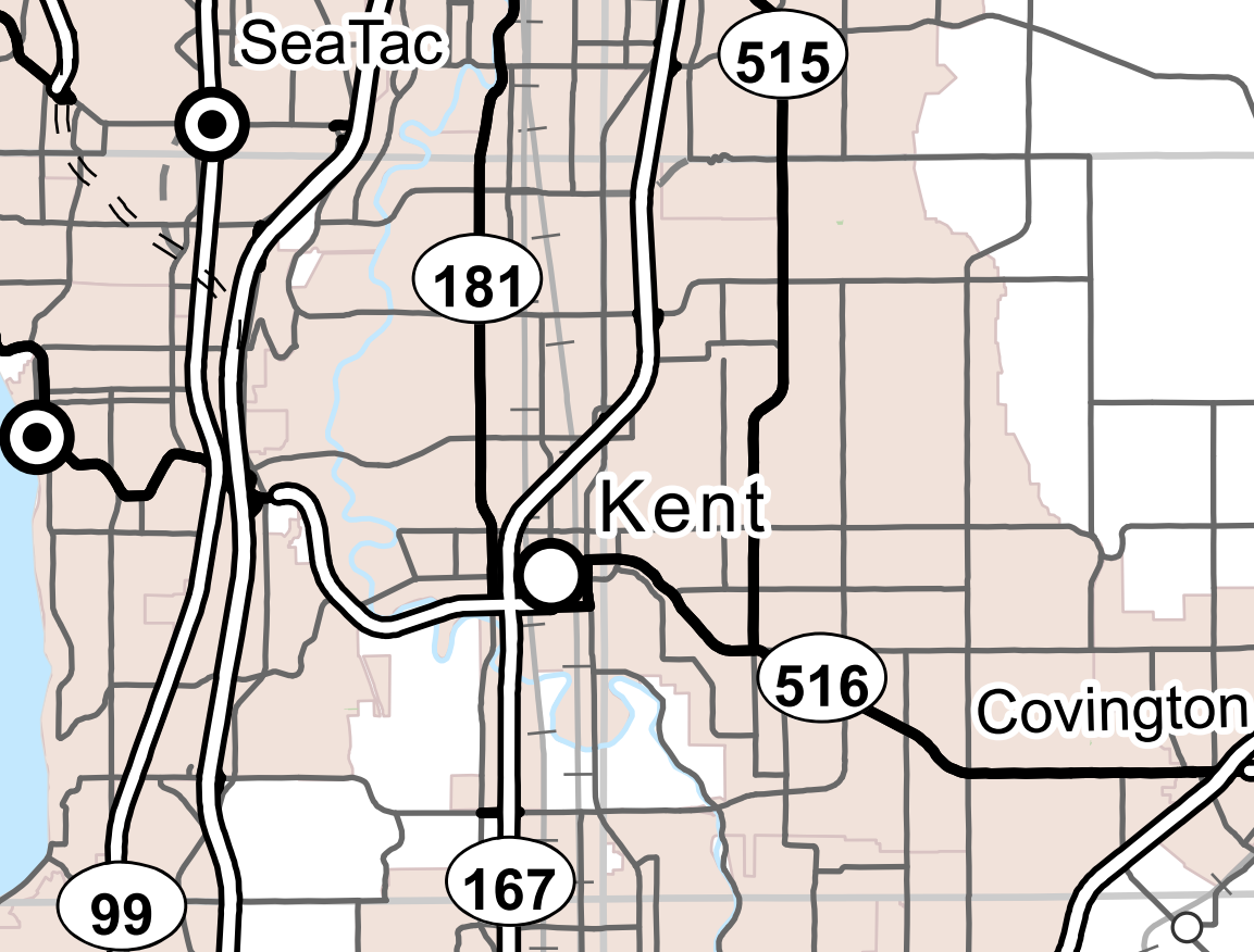 The City of Kent has a lot of roads like Kent-Kangley, which also functions as State Route 516. There’s 104th Avenue SE/108th Avenue SE through the East Hill neighborhood (SR 515), and the West Valley Highway through the heart of Kent’s industrial district (SR 181). And on the far west edge of the city is Pacific Highway S (SR 99), one of the most dangerous roads for people walking in the entire state.