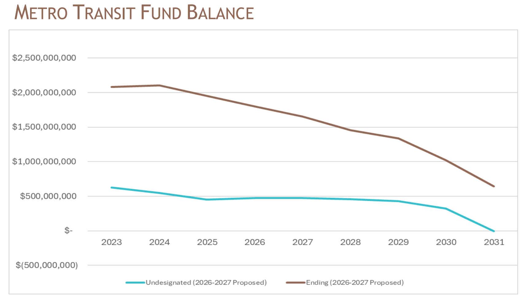 “Metro’s current revenue sources are inadequate to fund the current level of operations and an ambitious capital proposal in the longer run,” the Executive’s budget book notes. “By 2031 Metro will exhaust its undesignated fund balance and will either have to reduce spending or start to use reserves set aside under current policies.”