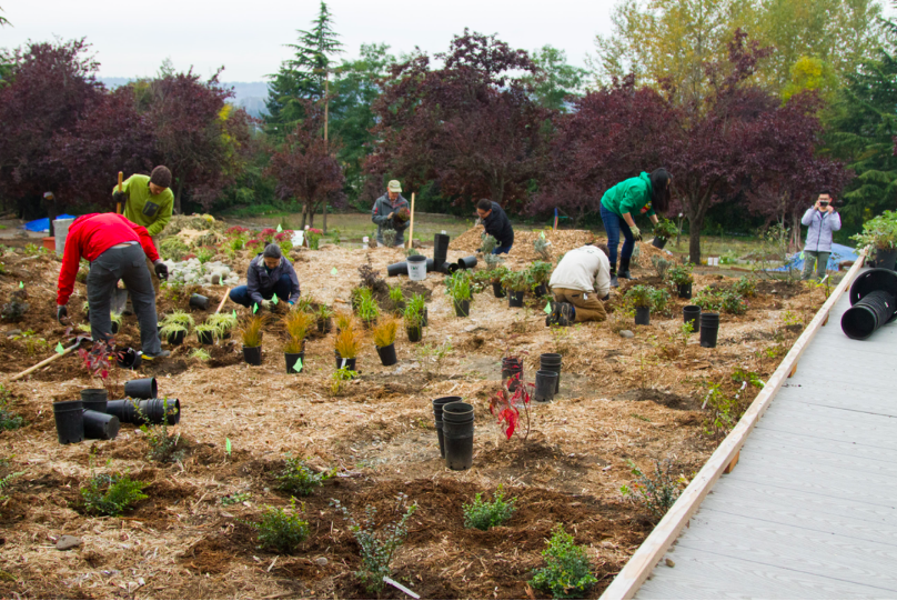 Paradise Parking Plots made for a compelling backdrop for Executive Constantine’s remarks in part because the garden provides more to the health of community than fresh produce. The garden, which was funded in part by King County Water Works, contains a food forest, water filtering rain gardens, and a rainwater capture system that slowly releases water into the garden providing irrigation in a manner that prevents flooding. Together these features help to prevent from stormwater pollution from entering Puget Sound. Heavier rainfall in the region caused by climate change has worsened the problem of stormwater pollution, placing it on the growing list of environmental problems worsened by climate change.
