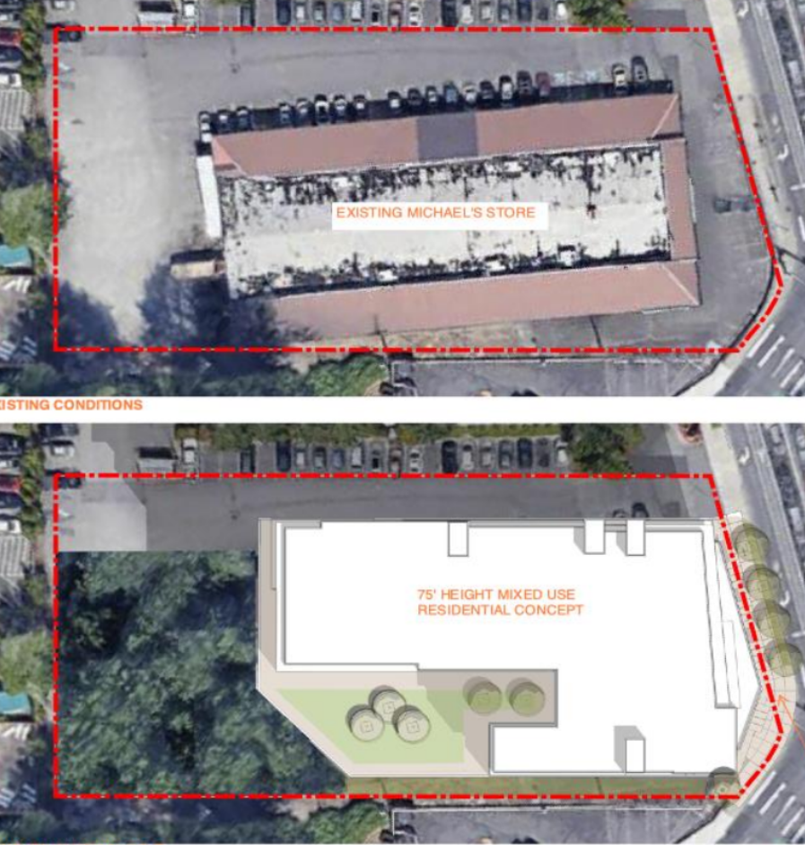 The idea of allowing dense multifamily development on these parcels has faced opposition from within Kirkland, particularly when it comes to the Michael’s site, which is close to the Lake Washington shoreline and within a stone’s throw of two popular city parks. With a wetland buffer precluding development on over a third of the site, the developers eyeing redevelopment of the dilapidated craft store emphasized that a seven-story height limit would be necessary to allow the proposed apartment building to pencil out as feasible. With the rezone completed, 250 to 300 units can now advance.