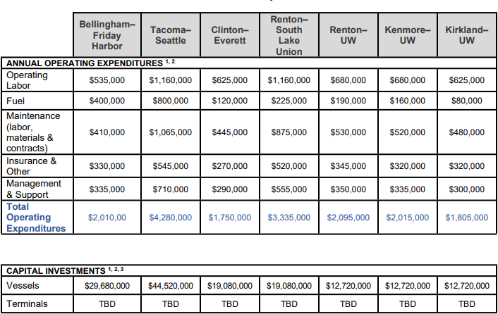 For PSRC’s hypothetical routes, financial analysis found annual operating cost ranging from two to four million dollars. Operating costs are a reflection of route length that causes higher operating, maintenance, and fuel costs. High capital costs for Bellingham-Friday Harbor and Tacoma-Seattle can be attributed to the need for a larger vessel for seaworthiness and passenger comfort. Routes like Tacoma-Seattle and Renton-South Lake Union also need an extra vessel due to the length of the routes, further increasing capital costs. Overall, initial investment costs for each route start in the $10 million range and can reach in to the high tens of millions, as terminal costs are given a Rough Order of Magnitude estimate of $5 million to $35 million if a replacement or new build is needed.
