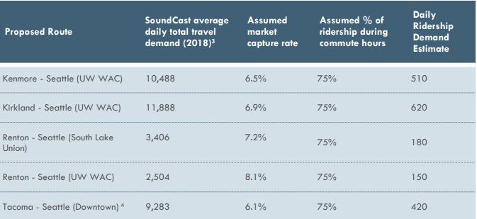 When The Urbanist last reported on the study, PSRC had only screened the numbers of routes to just eight with the eighth route still to be decided between Suquamish to Seattle or South Whidbey to Everett. The agency has since selected the second option for the draft study, and eliminated Gig Harbor to Seattle from further analysis. The remaining routes were put through the latest set of analysis and assessment that include travel time savings, capital and operations costs estimation, and ridership demand analysis.