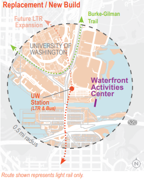 While not studied in depth enough to develop terminal costs, the agency does explore hypothetical landing sites for infrastructure and regulatory needs. Multimodal connections and local context are also inspected. For example, the UW stop that serves three of the routes in the study would need to have its existing dock by the Waterfront Activities Center be replaced to support services. A replacement would have to be compatible with existing uses, the crew team, and recreation boating. Proximity to the light rail and bus service seems like the main attraction of this potential terminal, accessibility improvements are noted as a need for those connections to be realized.