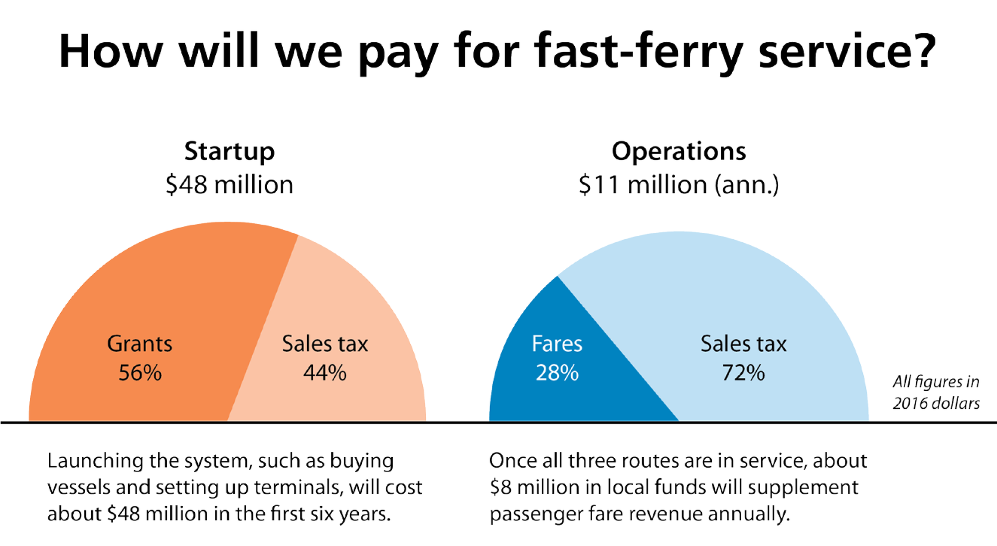 The idea lived on, however, when the state and Kitsap Transit secured federal funding to study the environmental conditions. The study concluded that a catamaran with a foil could achieve high speeds with low wake, and in 2009 the $5.9 million prototype Rich Passage I was delivered. Kitsap Transit then worked on a business plan that found a 0.3 percent sales tax could fund capital projects, operations, and maintenance. In the 2016 general election, voters approved the tax, which will raise about $12 million a year.