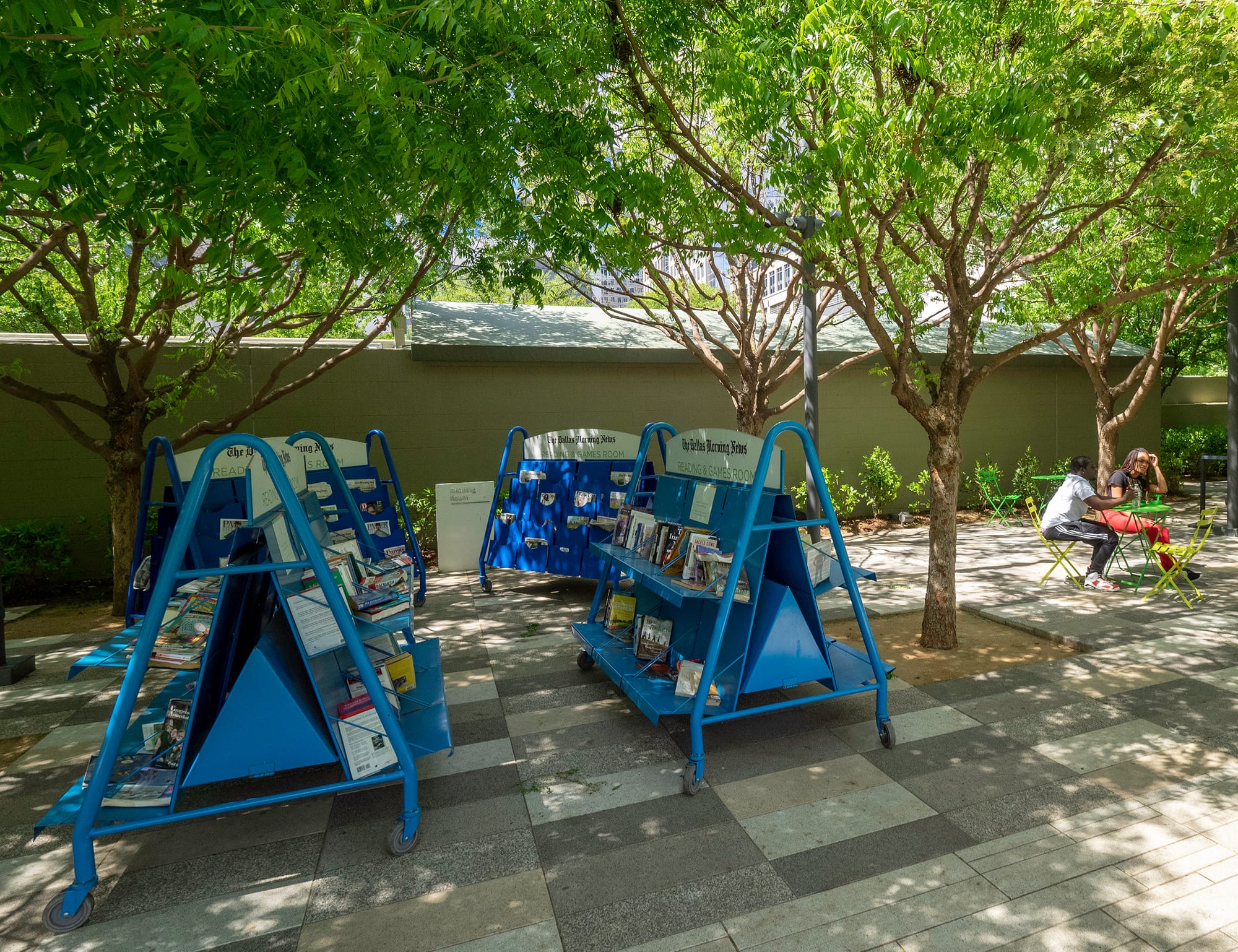 One neither needs to play table tennis, wade in the waters, nor play a pick-up game of soccer in the Great Lawn to enjoy the park. Should you wish to simply stroll, there is the aforementioned and very lovely allée of trees. Having had the good fortune to stroll among the great parks of the United States and Europe, this pathway leaves little to be desired. Its now mature trees, ample seating opportunities, and classic crushed gravel path are complemented by perfectly spaced, and by appearance, custom designed light poles whose gentle arcs not only enhance the space’s intimacy but also harken to the crescent pathway across the Great Lawn. For the more leisurely-minded, several carts with books, magazines, and newspapers, sponsored by the Dallas Morning News, are available at the edge of the lawn.
