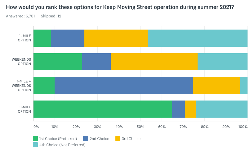 But the final proposal differs from the result of SDOT’s survey of nearly 7,000 Seattle residents in which approximately 65% of respondents said their first choice for Lake Washington Boulevard was a three-mile option every day of the week. Adding in people who said it was their second choice, seven out of ten respondents rated having an open street every day of the week very highly. The weekends-only option only received a top ranking from a little over 20%.