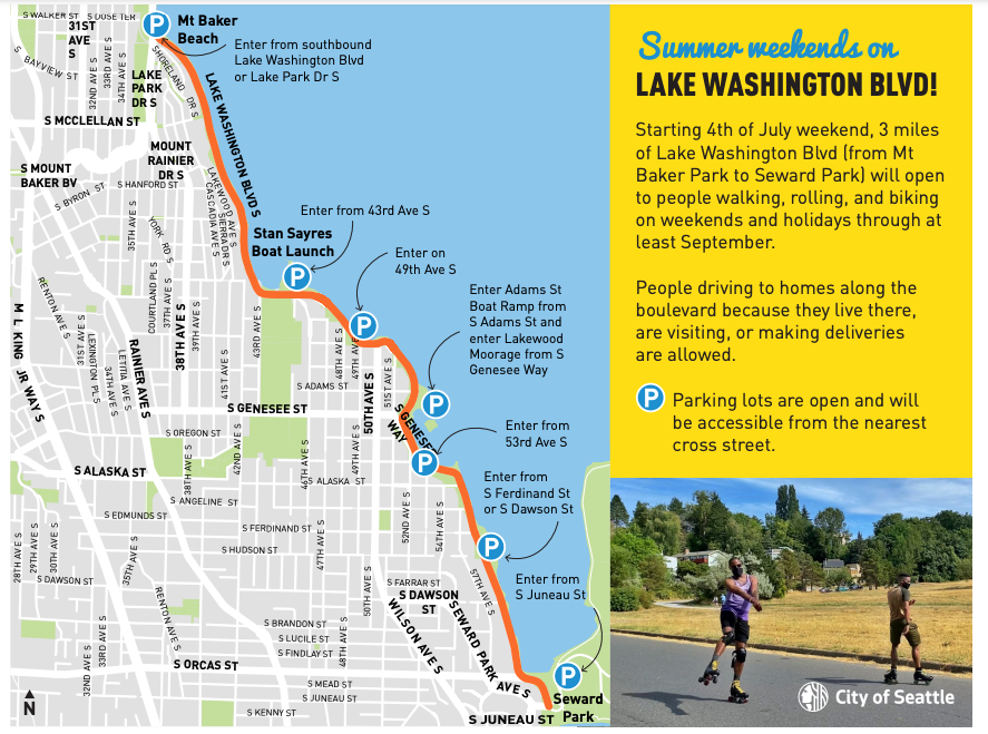 The Seattle Department of Transportation (SDOT) in conjunction with Seattle Parks and Recreation has announced that Lake Washington Boulevard’s open street will be extended all the way south to Seward Park starting the weekend of July 4. Intended to provide space for people walking, biking, and rolling, the closure to through car traffic has been in place on weekends along a one-mile stretch of the street between Mount Baker Beach and Genesee Park. The three-mile version will significantly expand the open street, directly connecting Seward Park’s car-free trail with a Lake Washington Boulevard with significantly fewer vehicles on it.