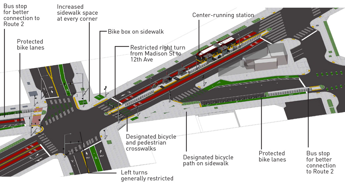 The other major intersections are around 23rd Avenue and 24th Avenue at Madison. Original plans for stops had the RapidRide stops in both directions close to 24th Avenue, which would require a steep uphill transfer to the planned RapidRide route along 23rd Avenue. In this phase of design, the westbound stop has been moved closer to 23rd Avenue.