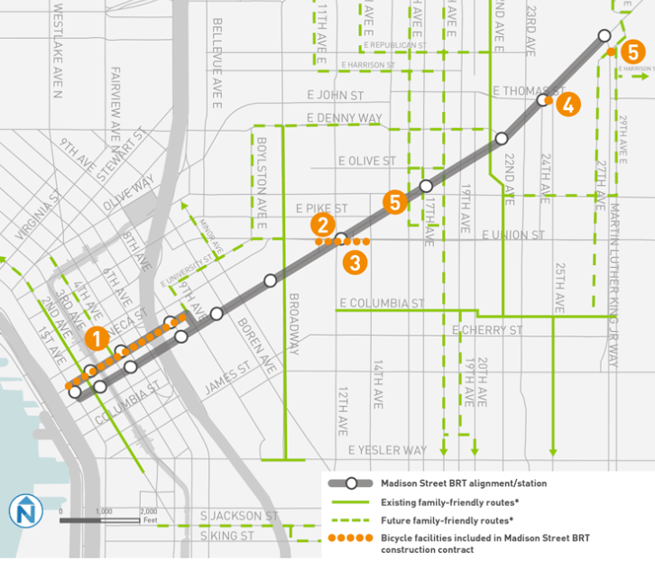 The bike component of the RapidRide G project has always been up in the air in terms of what projects are considered “in scope” and paid for in the project budget directly. Because no bike facilities will be on Madison itself, all of the bike components are considered “parallel” facilities despite the fact that there aren’t any parallel streets to Madison, except in Downtown.