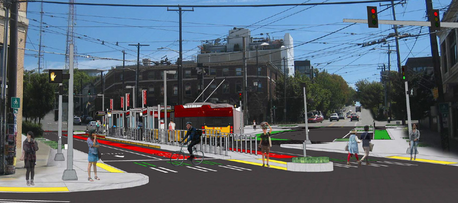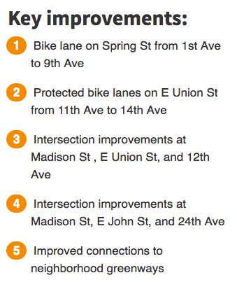 The other major bike component has always been protected bike lanes on E Union Street, which is currently a well-used corridor for bikes between Broadway and the Central District, due to its low grade. Now it’s clear that the RapidRide G line will only be paying for a protected bike lane on E Union St between 11th Avenue (two blocks shy of the Broadway Cycletrack) and 14th Avenue. Additional funds to extend the bike lane would have to come from and be prioritized to coincide with investments from Seattle’s bike master plan.