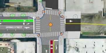 Original plans only included a bike lane in Downtown on Spring Street between First Avenue and Fourth Avenue, next to the curb. After hearing from the public that going to Fourth Avenue would not be enough, the bike lane has been extended in the plans up Spring Street to Eigth Avenue. However, there are a few clear problems with the design of this new extended lane from a safety standpoint.