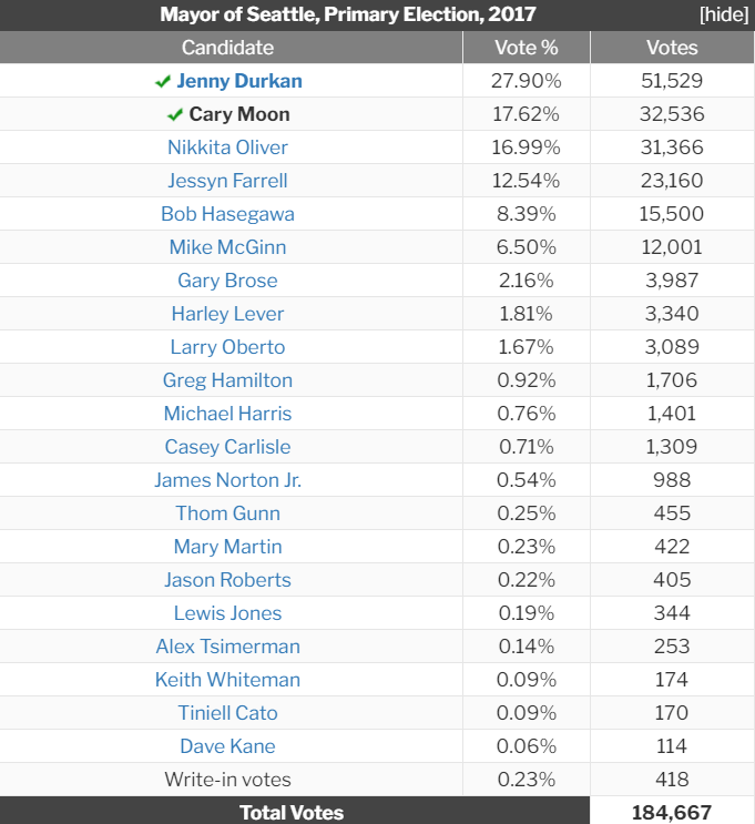 Nikkita Oliver gained 17% of the vote, Jessyn Farrell 12.5%, Bob Hasegawa 8.4%, and Mike McGinn 6.5%. Fifteen candidates, including beef jerky baron Larry Oberto, split the remaining 10% of the primary vote. Second and third choice votes may have propelled a runner up into second place or even first. We’ll never know because our election system doesn’t ask.