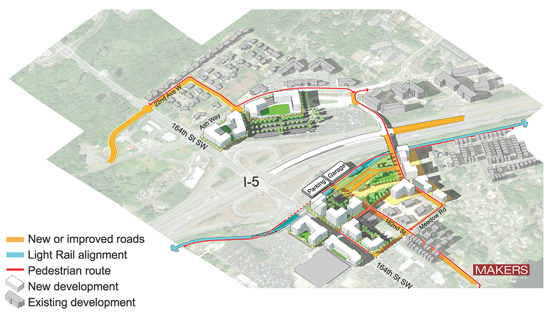 The survey includes a description of transit-oriented development (TOD) that suggests that mixed-use buildings ten stories high or more (some areas already permit this level of density) are envisioned with an eighth mile of the station–along with a plaza or open space to act as a community focal point. Snohomish County described mostly residential midrise buildings in the next eighth mile out, while low-rise up to six stories are assigned between a quarter mile and a half mile out.