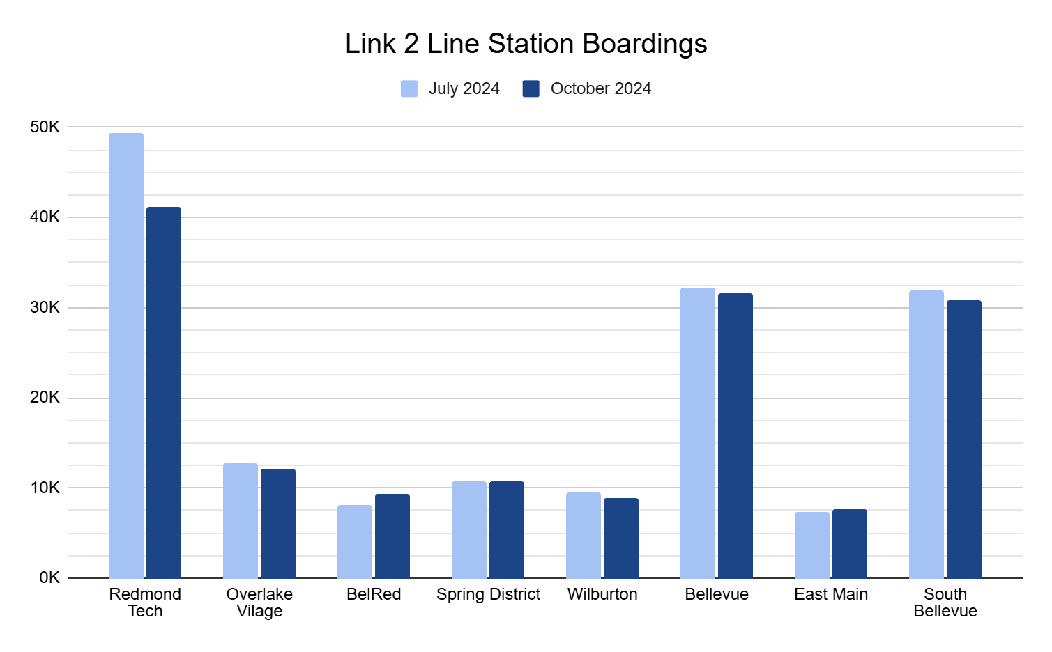 It’s not immediately clear what drove down numbers on the 2 Line. Redmond Technology Center saw the largest dip in boardings comparing July (49,292) to October (41,139). Besides the northern terminus, most 2 Line stations saw little change in boardings.