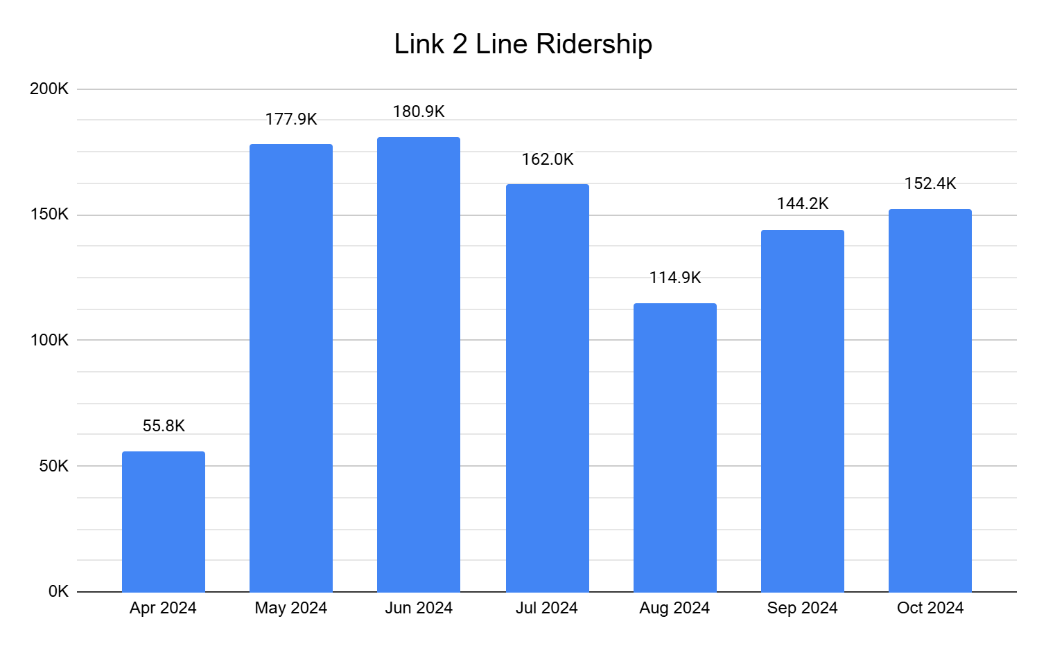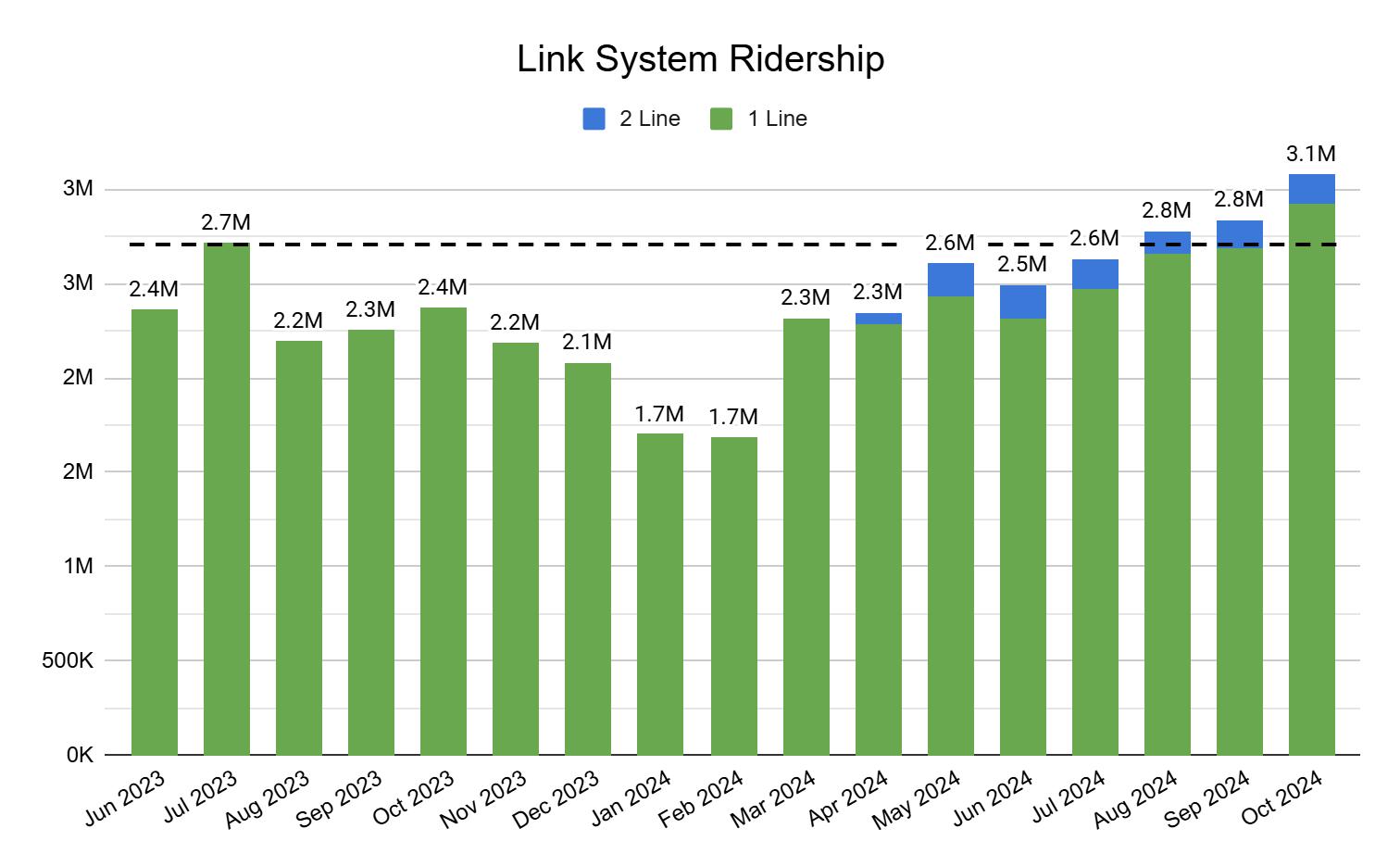 been strong, being one of Link’s busiest months. It’s therefore unclear whether October 2024’s total ridership numbers are representative of a new normal commuting pattern and how strong the usual temperance of demand that accompanies the winter months will be.