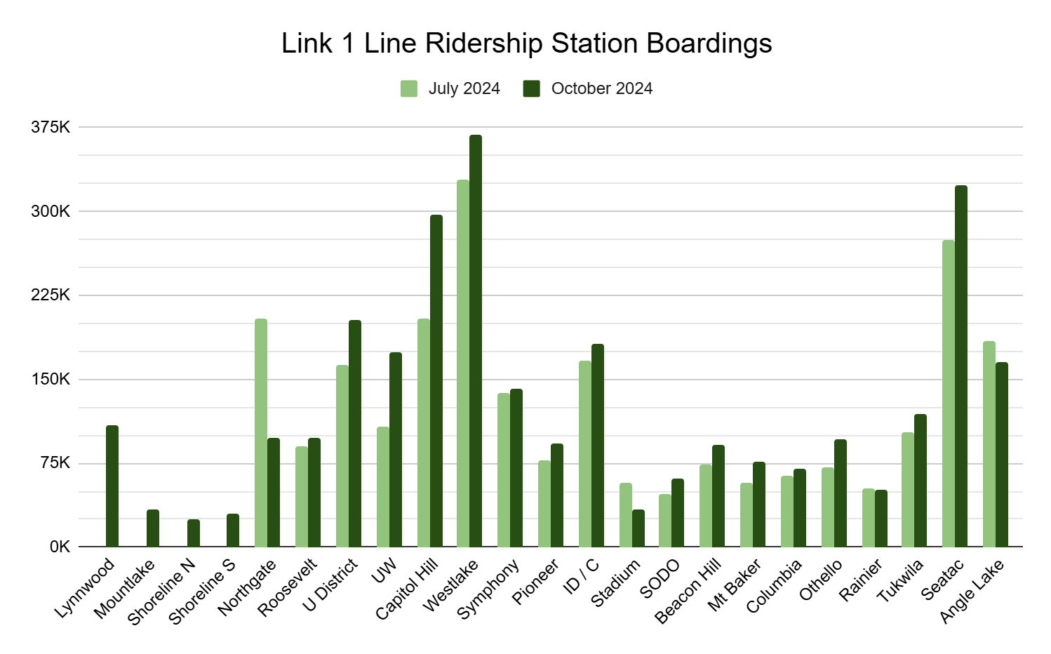 Across nearly every metric, October was an impressive month for Link 1 Line history. It’s likely many of the records of October 2024 will stand until at least July 2025, when the rush of Seattle summers buoys ridership upward once again.