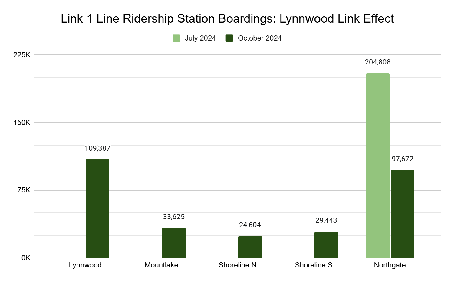 The three other Lynnwood Link Extension stations besides Lynnwood City Center did not perform as strongly; Shoreline North is now the least boarded station in the network, and along with Shoreline South and Mountlake Terrace, all three were boarded less than the previous least boarded station, Stadium.