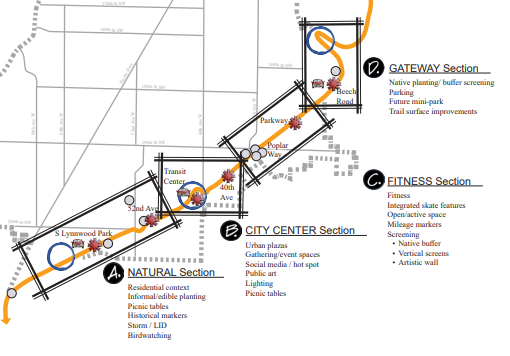 The existing trail is narrow, impassable to cyclists, and damaged by natural forces. The City hopes to connect transit modes, trail systems, housing, and employment centers with enhanced pedestrian and bicycle mobility. Those plans fit together until Lynnwood’s vision to create an urban city center around its central light rail station–which explains naming the station Lynnwood City Center. Improvements include 10-12 foot wide trail with elevated boardwalks in wetland and stream areas, strengthening the connection between the city’s future light rail station and bicycle and pedestrian infrastructure.