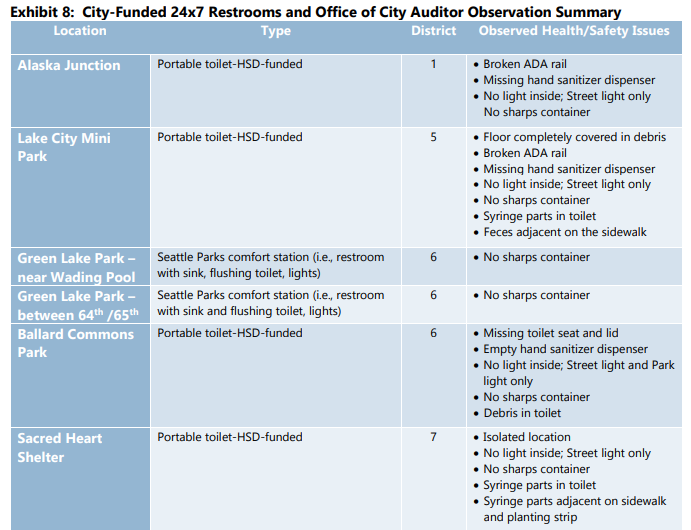 At the city council briefing, the city auditor’s team broke down how the city’s six 24/7 restrooms across the entire city compares to an international standard for restroom access: the United Nations’ (UN) standard for refugee camps. If Seattle wanted to use the UN standard to determine how many restrooms would be available for its unsheltered population, it would need to construct 224 restrooms. Again, there are six.