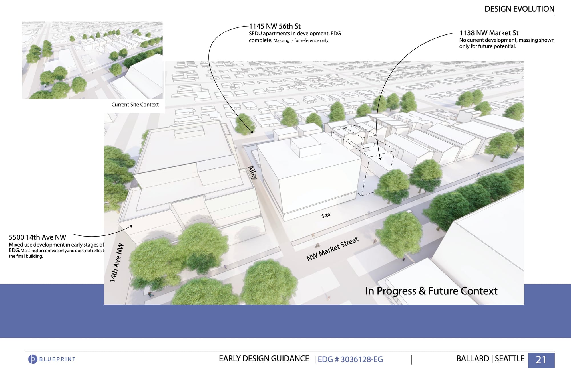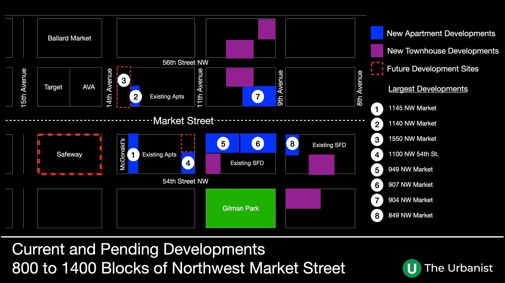 The largest potential development site is just west of these changing streets. The south side of Market Street’s 1400 block is currently occupied by a Safeway. As followers of Natalie Argerious’ articles and The Urbanist Podcast know, Seattle’s Safeways have been developing upward. This one can go up and down, as it is the preferred location for Ballard’s Sound Transit station.