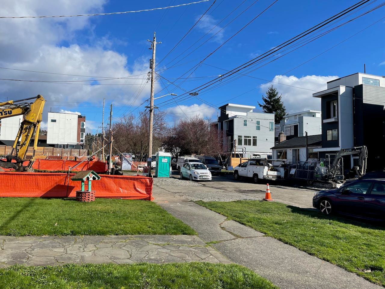 During my walk through these streets the whole area felt like it was a single large construction site. Work trucks for trades occupied the curb spaces posted with temporary “No Parking” signs. The staccato of pneumatic nail guns mixed with beeping of backing up cherry pickers. Orange drift fences and broken sidewalks abound. It is understandable if longtime neighbors feel that the pace of change is irritating if not frightening.