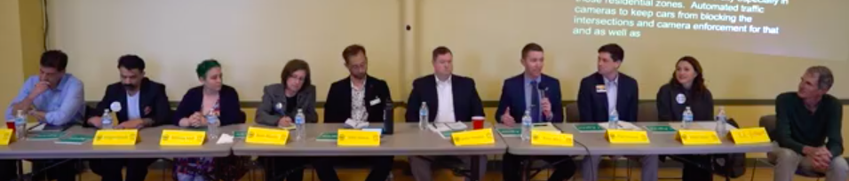 The need to address climate change was a theme throughout the evening and with some small exceptions, candidates seemed largely in agreement that improving public transit and increasing urban density offered the best means for Seattle to reduce its carbon footprint. Pottharst became the first candidate to call for congestion pricing Downtown Seattle as a means for funding the acceleration of light rail completion. When asked later about congestion pricing, of all the candidates only Pottharst, Fathi, Wills, and Strauss expressed support.