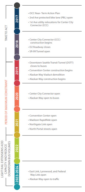 The One Center City partners–the Seattle Department of Transportation (SDOT), King County Metro Transit, Sound Transit, Seattle Office of Planning and Community Development, and the Downtown Seattle Association–define the period of maximum constraint from 2019 to 2021. Since key protected bike lanes are pushed back to 2021, they are not a part of the strategy to deal with this constrained period. In fact, it would appear SDOT has again sacrificed bike lanes on the altar of preserving level of service for motor vehicles, which they can rationalize since it means transit will move a little faster.