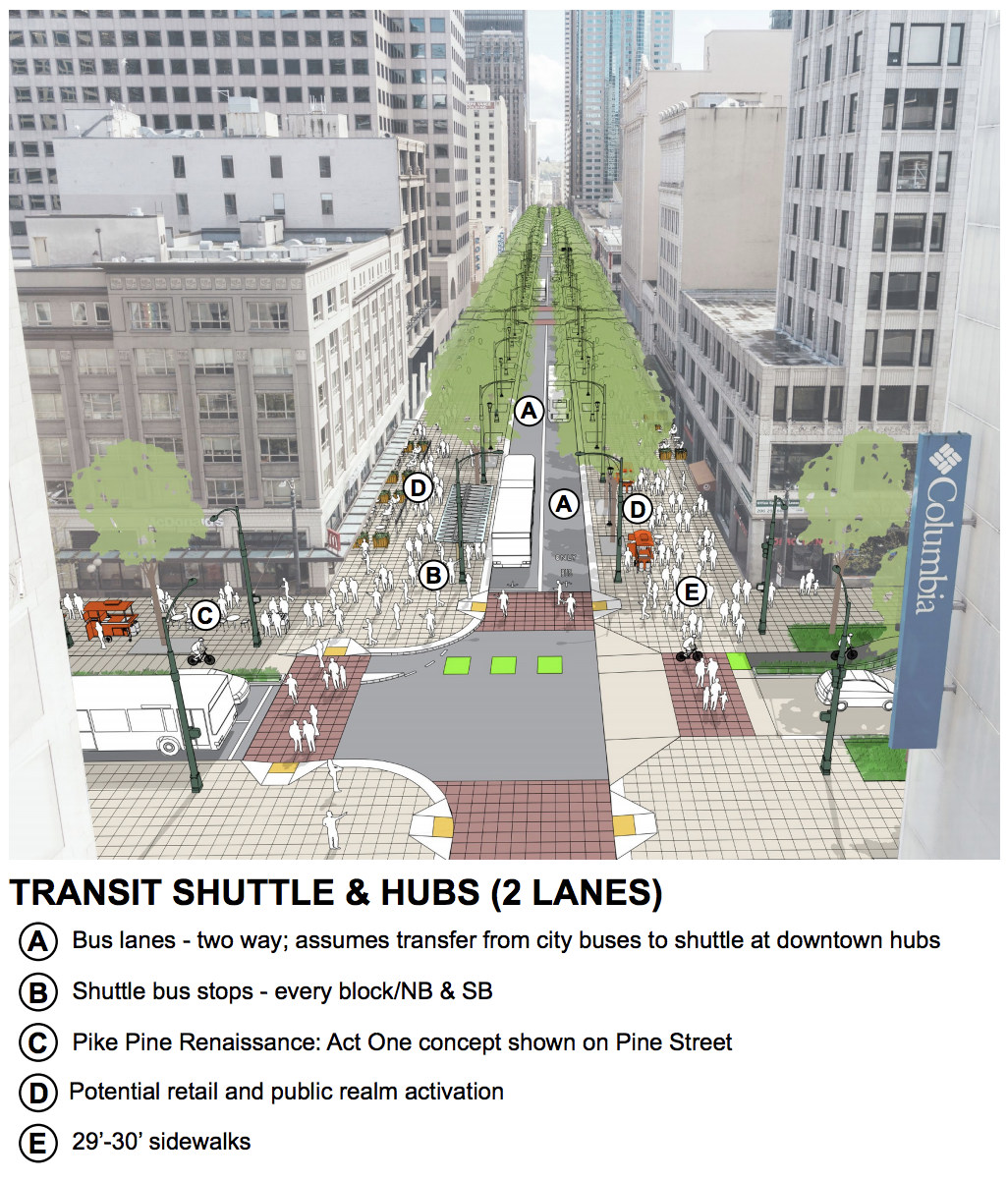 That larger vision of more sidewalks and fewer bus lanes hinged on light rail extensions opening and diverting riders from buses to trains — and potentially a downtown transit shuttle which could truncate bus routes at its ends to decrease the bus traffic on Third Avenue, which is Seattle’s only bus-only street between Stewart Street and S Washington Street. For now, Third Avenue is the busiest bus corridor in the state.