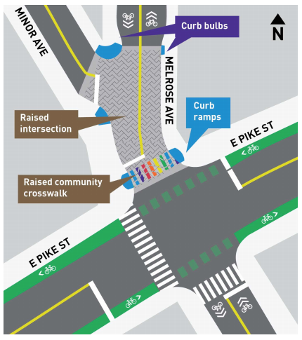 What would likely be Seattle’s largest raised intersection is planned at the intersection of Melrose Avenue and Pike Street, an area that is begging for pedestrianization like few others in the city. Last year, SDOT constructed a protected bike lane on either side of Pike Street, and so left turns across the bike lane onto Melrose were prohibited, but that restriction is frequently ignored. With the Starbucks Roastery as a big draw for foot traffic, conflicts are myriad between street users. SDOT’s plans show a raised intersection all the way from the crosswalk on Pike Street nearly 100 feet back behind the intersection with Minor Avenue. SDOT also plans to widen some of the sidewalks on the block.