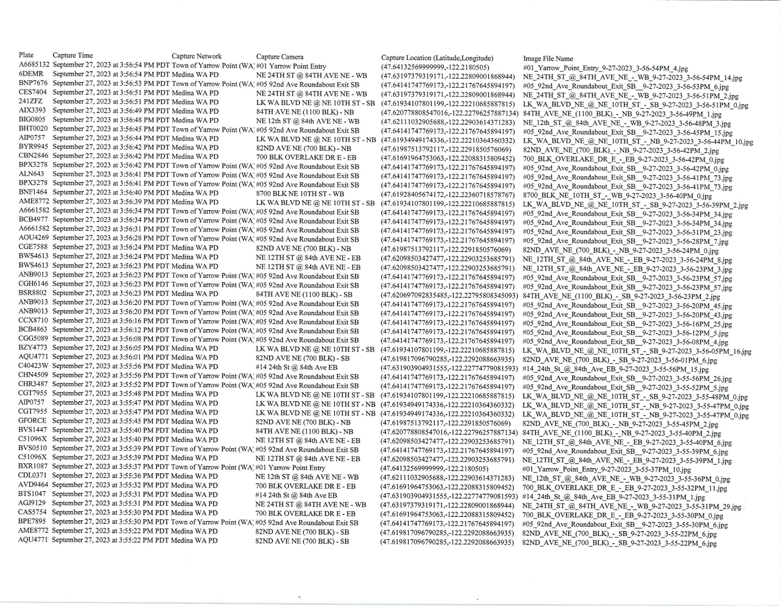 Contrary to what the Flock Safety representative stated, the system makes the precise date, time and location all easily accessible for download. The police department affirmed this is all available via a records request, either as a search or in bulk download; the captain went ahead and printed a snippet of the bulk data download, showing how many data points were available just from two minutes of scanning.