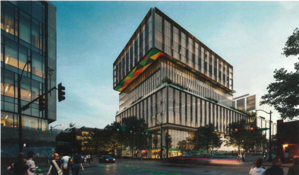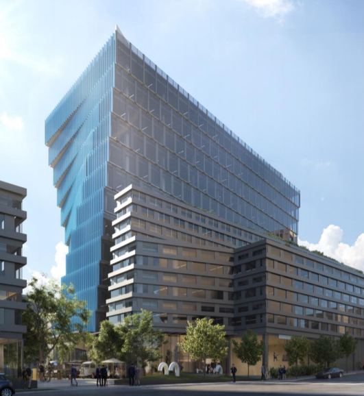 City representatives noted their selection committee thought it was a high quality design. “This is urban livability at its finest,” Councilmember Sally Baghaw said in the City’s press release. Some twisting and slanting features on the corners add some interest to the otherwise plain glass office tower.