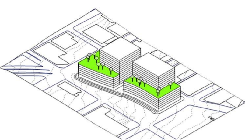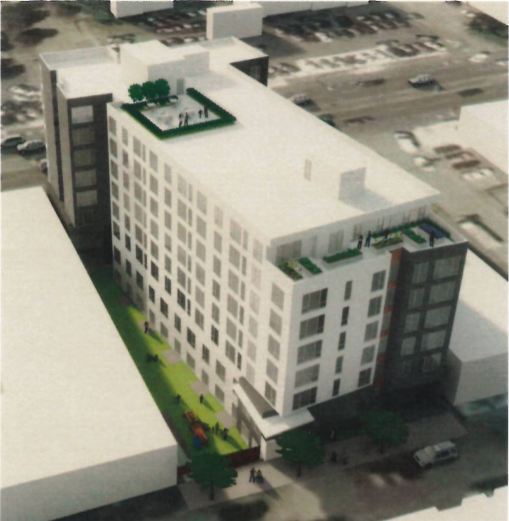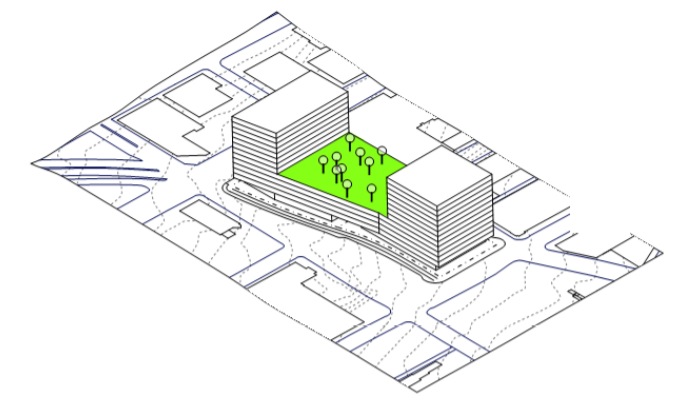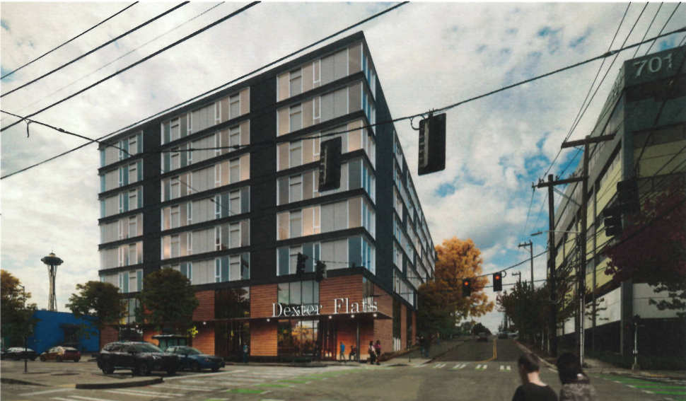 In the land swap scenario, Kilroy planned 224 market-rate homes at the Dexter block in a 8-story building. They also presented an option without the land swap that had a 175 affordable homes on the Dexter site.