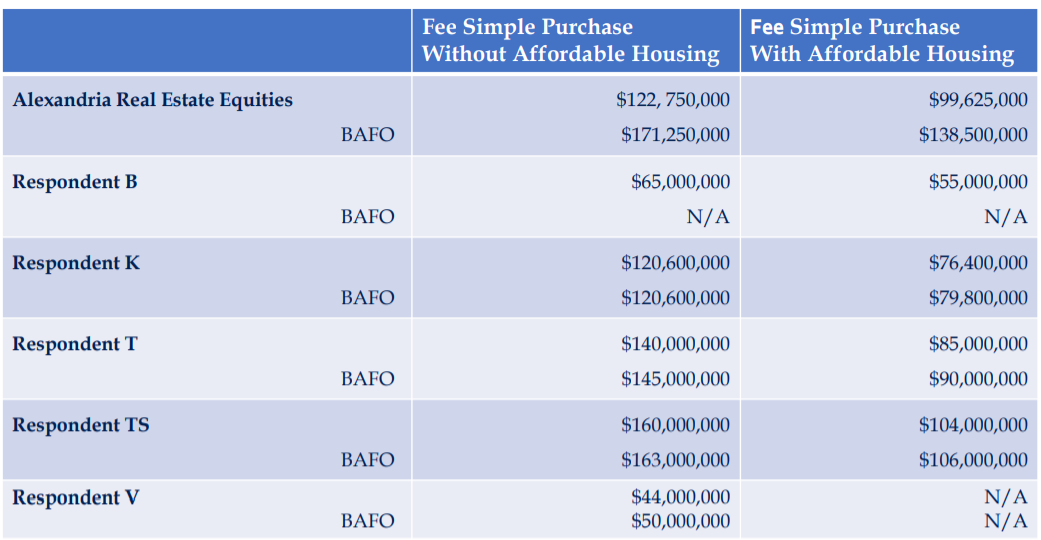 - Alexandria Real Estate– Best offer: $143.5 million, 175 affordable homes, and community center.