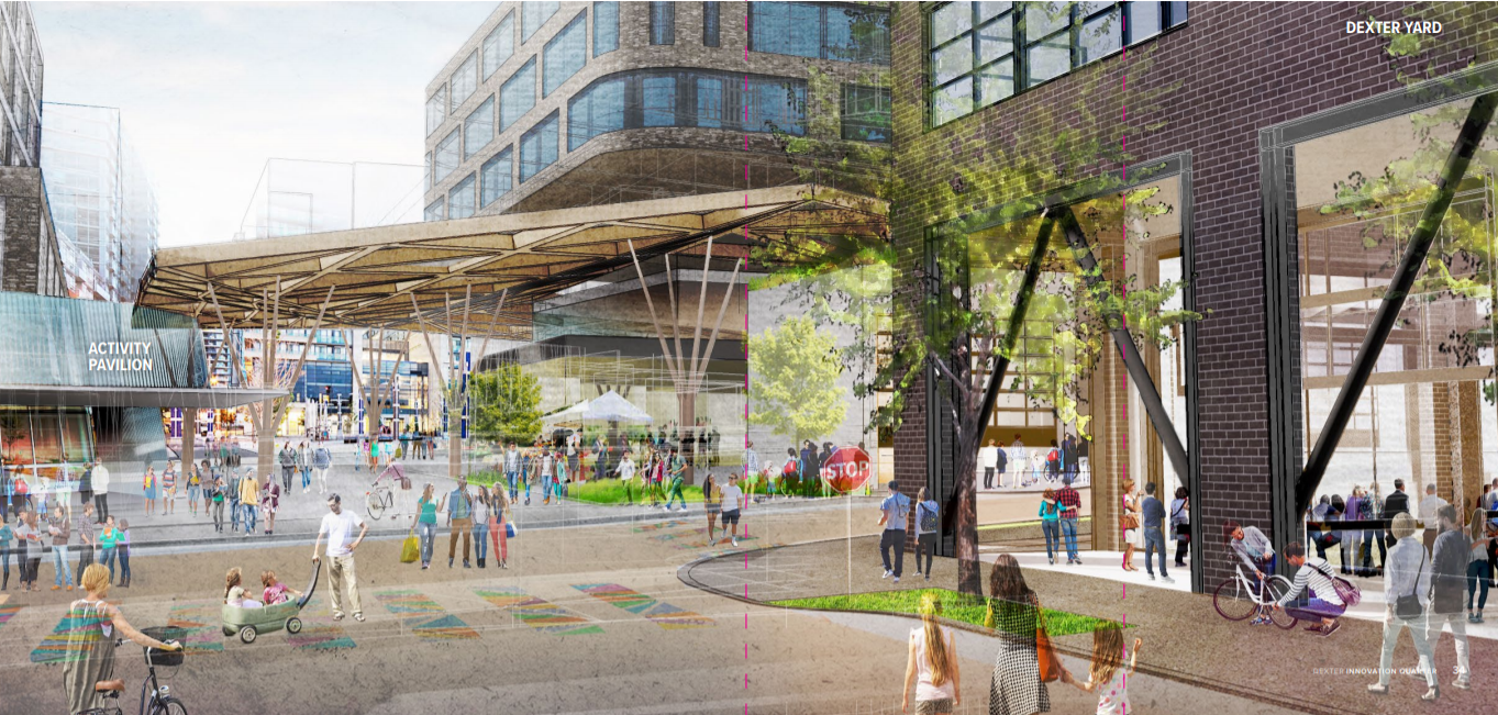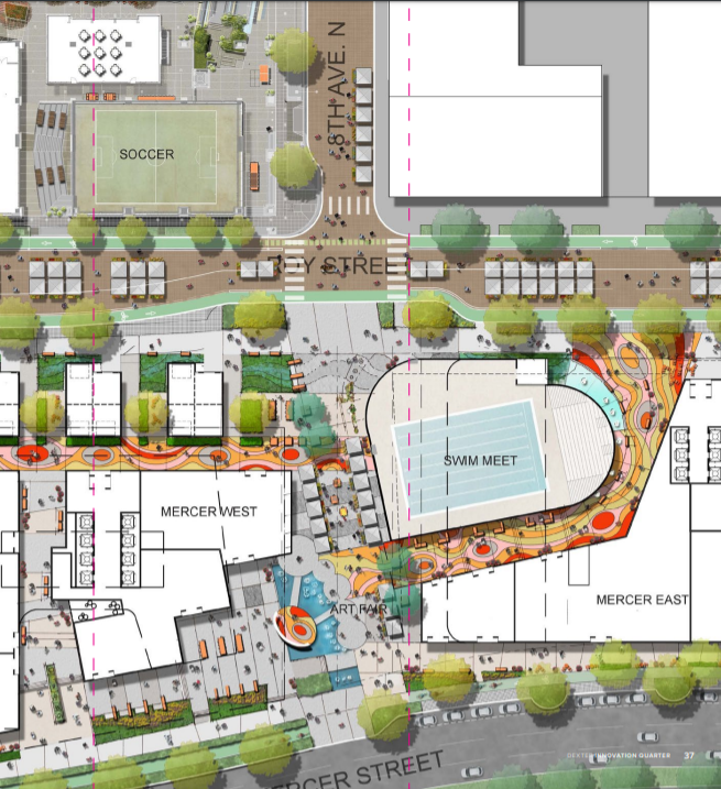 BioMed envisioned 8th Avenue as a festival street and laid out seasonally based ways to activate the space. In summer they highlight the pool, and suggest things like a swim meet and art fair to take advantage of the space.