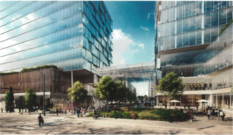 The second option was dubbed a Skypark with a long podium (extended over 8th Avenue) topped with an acre-plus park book-ended between two towers. Tishman argued this creates a great public asset. “[T]here is nothing of this scale and potential quality in Seattle’s offering,” Tishman states. “This rooftop could offer an elevated park with public and private spaces melding between retail, tenant outdoor space, a public park, and programed event space in a prime location by Lake Union.”