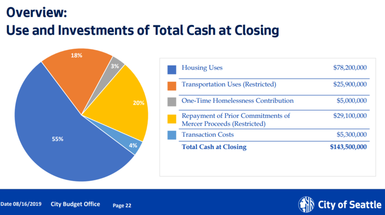 The Mercer Megablock is also unique in that the City believes that a large chunk of the money has to be devoted to transportation, specifically “highway purposes,” due to the source of the original funds to purchase the right-of-way for Mercer construction. Others, including former city council staffer Michael Maddux, disagree with this assessment but it appears likely that the Mayor will follow guidance of her budget director, Ben Noble, who espouses this view. That means nearly $26 million could be invested in transportation.