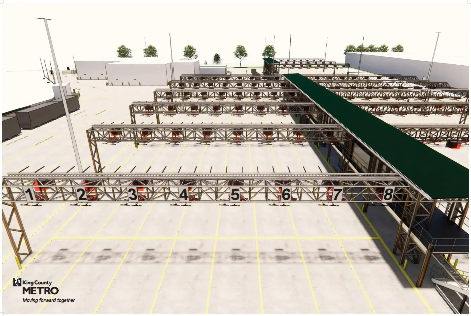 The new base will also look and operate definitively different from conventional bus bases with rows of overhead structures. Those structures will hold the charging equipment, which can be lowered to directly connect to the battery systems on top of buses. And new software technology will support management of equipment and efficient site operations.