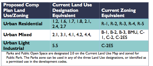 Urban Residential areas would primarily encourage multifamily residential development, but some mixed-uses and institutional uses would also be allowed. Urban Mixed would be some of the densest areas and allow wide mixing of commercial, residential, and institutional uses. Urban Light Industrial would continue to allow industrial uses while accommodating flexible commercial and multifamily residential uses.