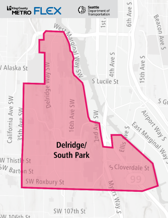 King County Metro will be expanding its flexible on-demand shuttle service, Metro Flex, to Southwest Seattle in partnership with the City of Seattle. The new service area will span Delridge and South Park, offering transit riders door-to-door service within it starting on Monday, July 22. This will add to local and RapidRide bus service already serving much of the area.