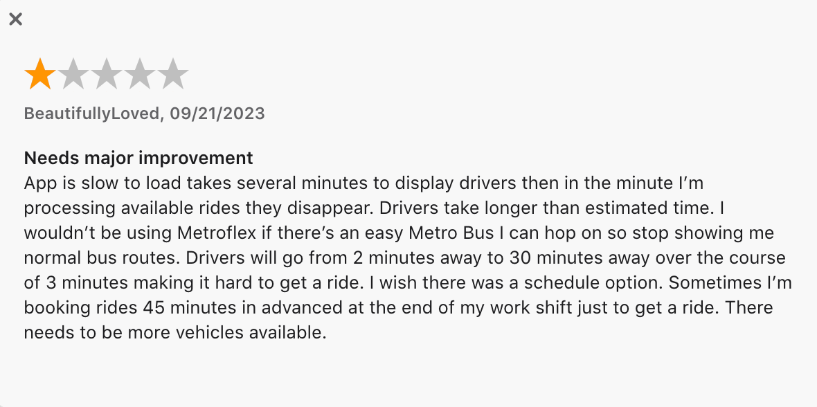 According to some, there’s a lot left to be desired. The Metro Flex app currently has a 2.3/5 star rating on the App Store and a 2.5/5 star rating on the Google Play Store. Although app store reviews aren’t the best indicator of service, they still provide important insight.