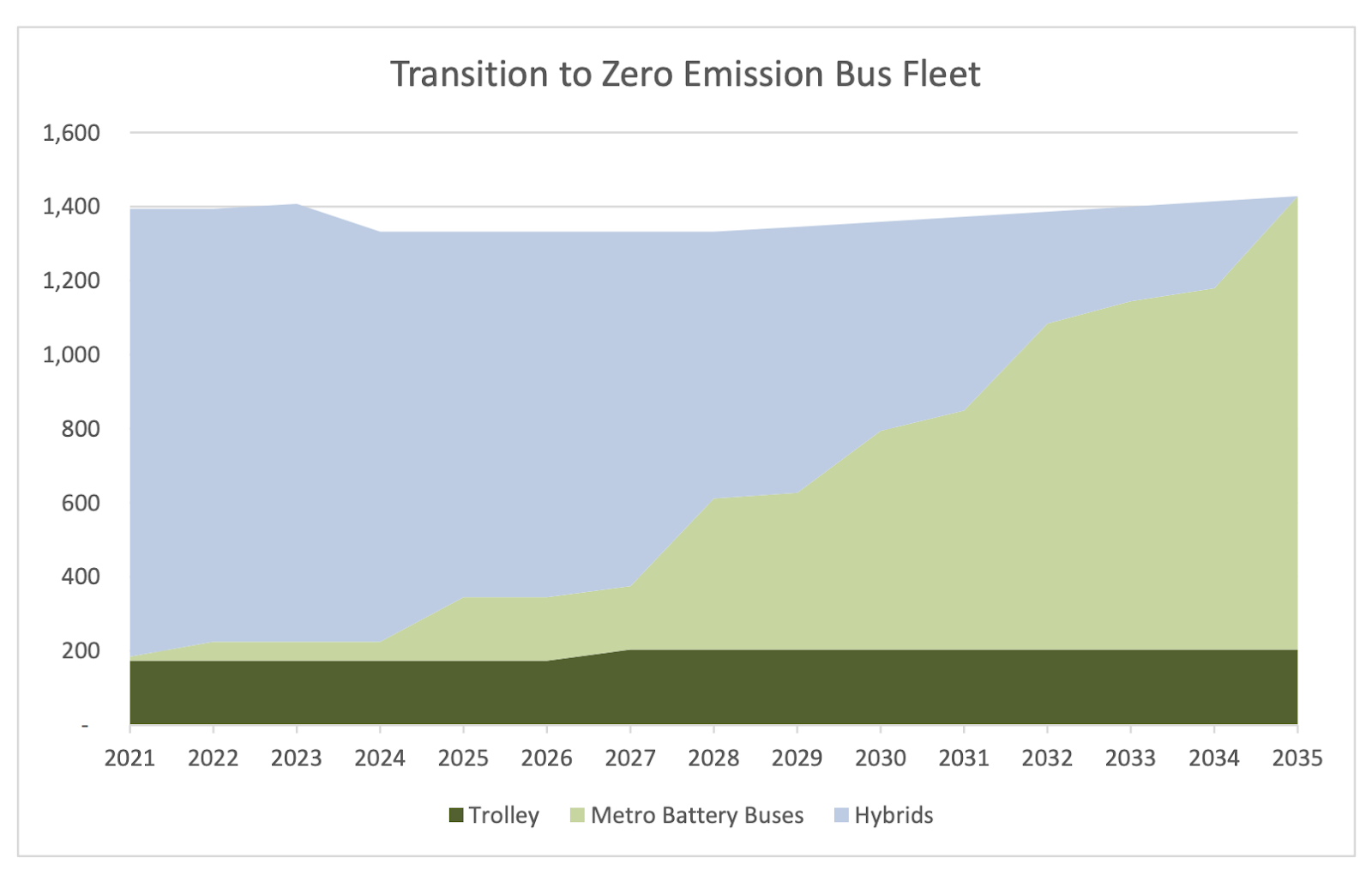 In 2017, Metro set a goal to electrify its bus fleet by 2035, but seven years later only about 50 of its 1,200 non-trolley buses are fully electric, which is just over 4%. The gradual rate of electrification stems partly from battery bus technology advancing slower than hoped.