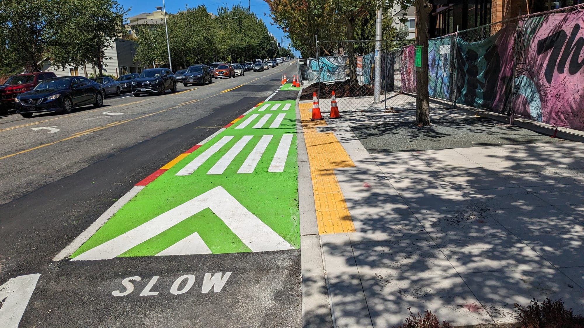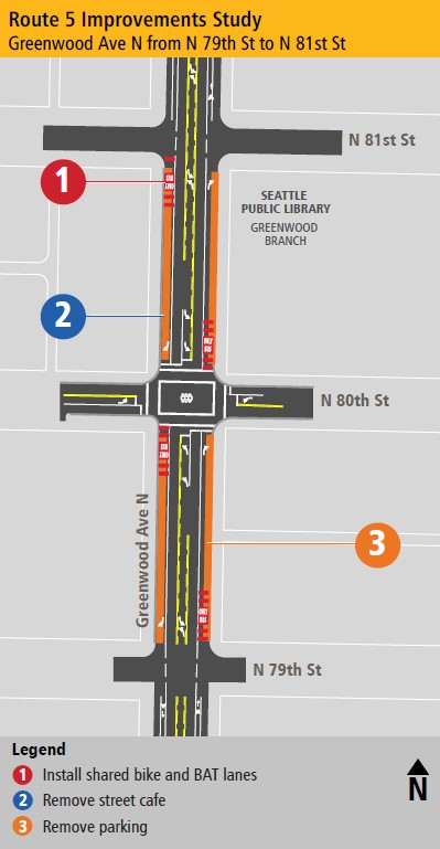 SDOT is already setting the stage for that with new bus loading platforms that include space for people on bikes: With these Route 5 upgrades, they would be installed at two more intersections, N 80th Street and N 85th Street. This should make it much easier for the city to come back and add fully protected bike lanes later.