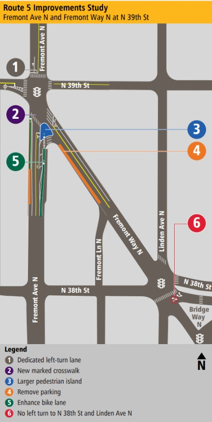 As it stands, there’s no way to cross the street on the south side of the five-way intersection at Fremont Avenue N and N 39th Street: a marked crosswalk would be added and the existing pedestrian island near the slip lane onto Fremont Way N would be expanded.