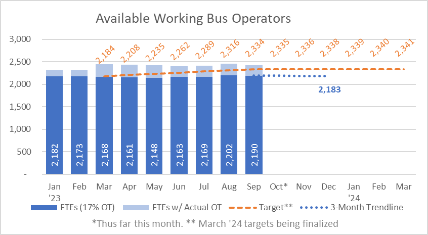 “Over the span of the last few months, we’ve seen modest growth in our bus operator workforce capacity when looking at full-time equivalents (FTEs) thanks to the promotion of part-time to full-time operators,” Metro spokesperson Jeff Switzer said. “We continue to rely on high overtime rates to deliver service, but after our recent service change, we’ve also seen a 5% reduction in bus operator overtime, which is a good sign.”