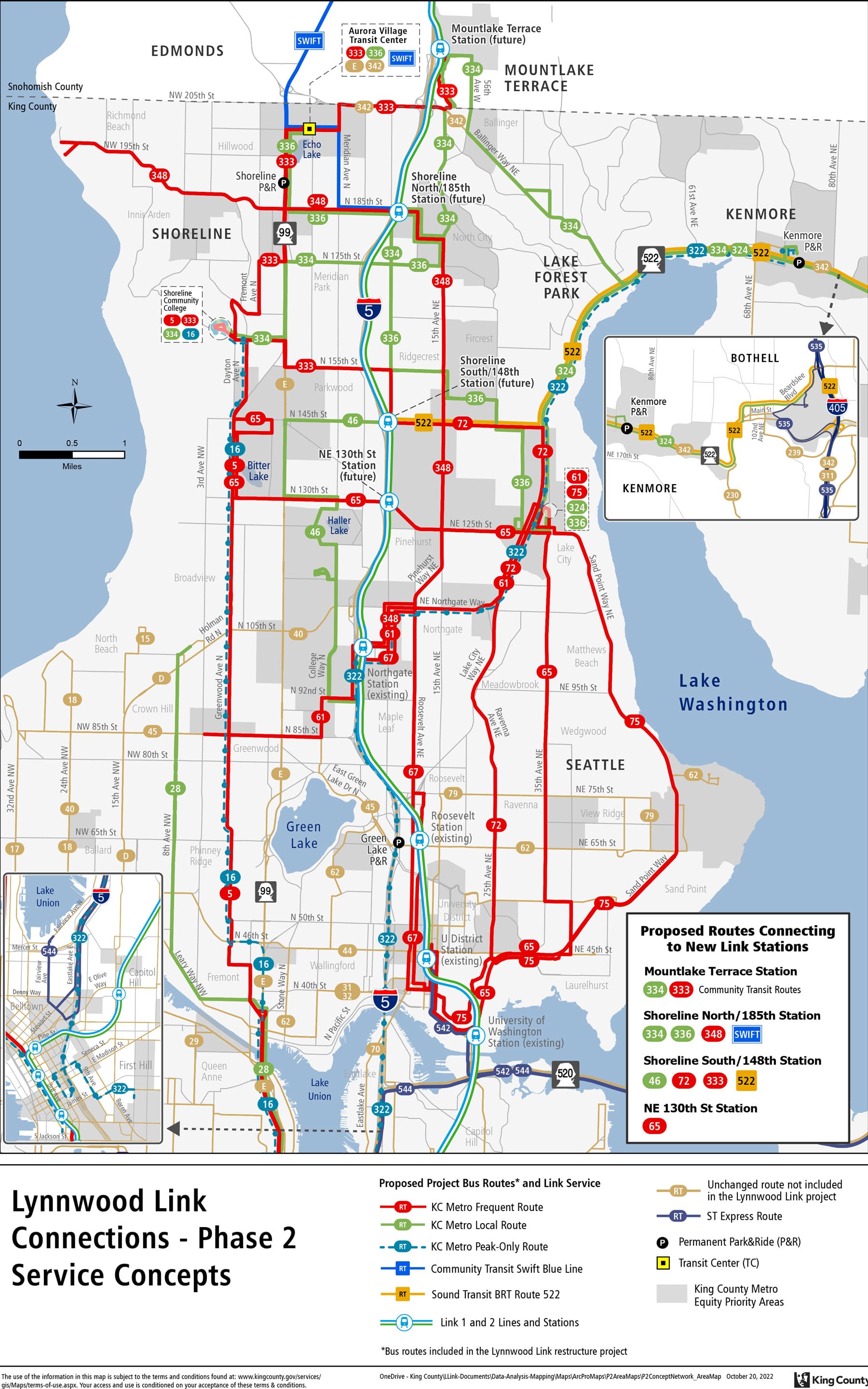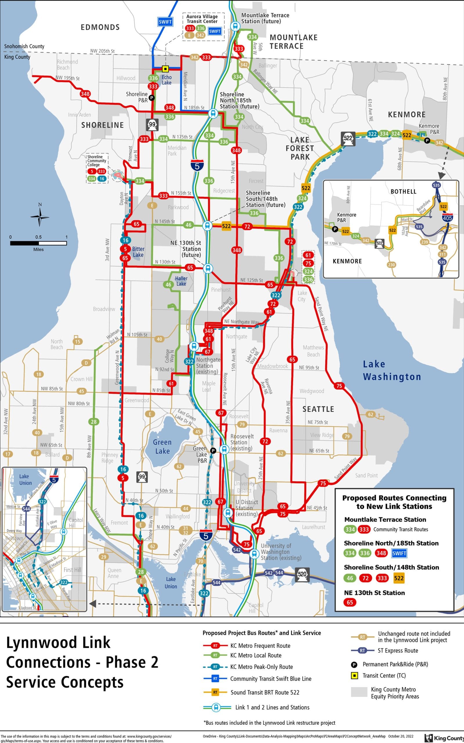 King County Metro is back with its next phase of the Lynnwood Link bus restructure process. The proposal focuses on feeding riders to new stations opening as part of the light rail extension and consolidating some redundant service. It also partially reintroduces some past ideas to offer better east-west connections in North Seattle and Shoreline neighborhoods, but they seem to mostly fall short of the type of crosstown routes long-requested by riders.