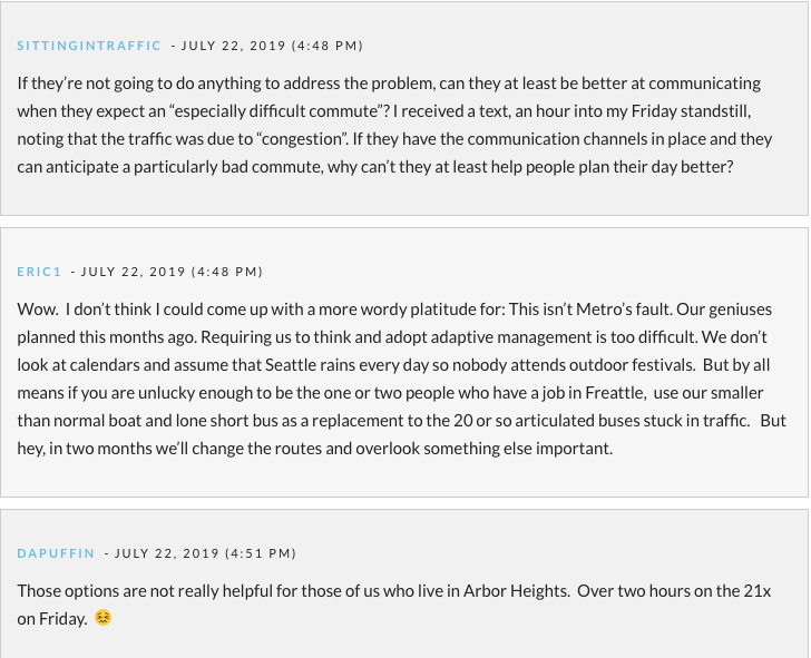 I’m not a regular passenger on any of the bus lines that have been impacted by the congestion, but I can remember sailing in and out of Downtown from West Seattle by bus a few times shortly before the Alaskan Way Viaduct closure thinking, “How will traffic engineers keep these bus lines moving without the viaduct?”