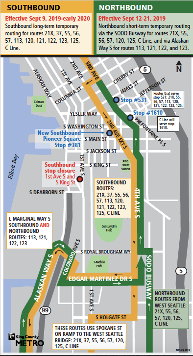 The southbound lines will move to 2nd Avenue at Columbia Street, transferring to 4th Avenue S at S Jackson Street in the International District and then either precede south through the Stadium District on Edgar Martinez Drive and Colorado Avenue S before eventually returning to Alaskan Way or use S Holgate Street access the Spokane Street on-ramp to the West Seattle Bridge.
