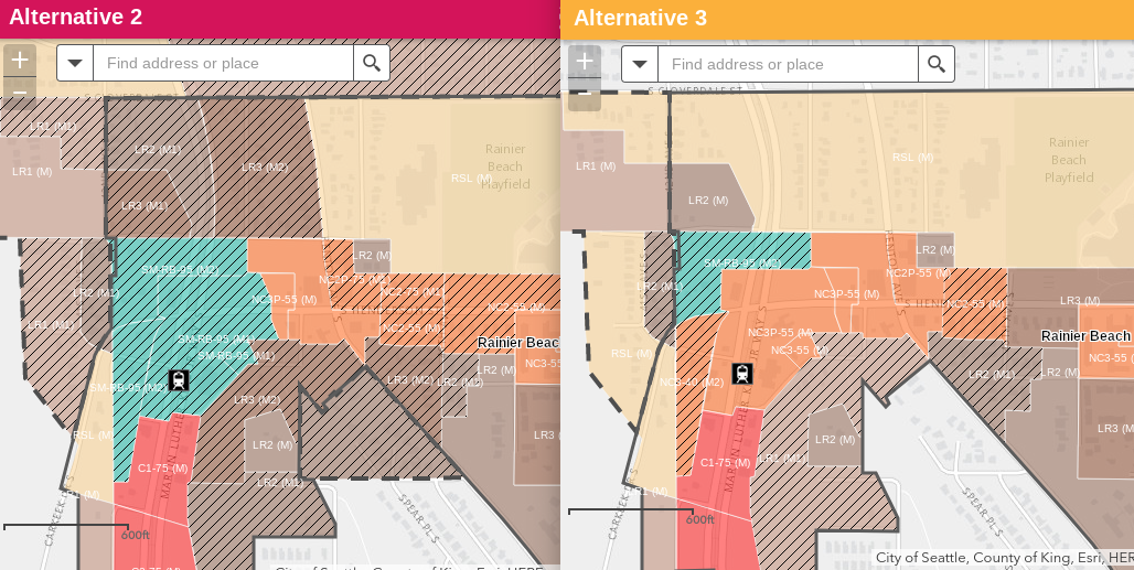 - Alternative 2 for Northgate would provide greater zoning capacity at the County-owned parking lot where a large affordable housing complex is planned right outside Northgate station. Alternative 3 scaled down the upzones in Northgate to reduce displacement risk, but parking lots have no displacement risk.