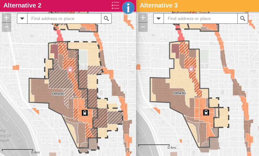 - Hybrid approach in Othello? In Othello some of the most pronounced differences between Alternatives 2 and 3 emerge. The Othello urban village expansion is much bigger in Alternative 2. Moreover, Alternative 2 includes significantly more LR3 east of Othello Station whereas those areas are RSL or unchanged in Alternative 3.