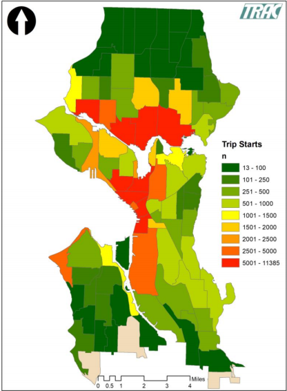 Or, to present another hypothesis, Seattle might have enough demand for 10,000 free floating bikeshare bikes if the bikes were more reliable and less clunky and slow. Clunky bikes don’t necessarily present a problem for short trips or leisurely joy rides, but a mature bikeshare network can be more than that. To convince people to subscribe to bikeshare, nimbler dependable bikes could be a big selling point. Better bikes could also convince more people to do the legwork of climbing hills, which does appear to be limiting usage areas judging by the map below.